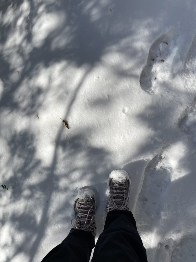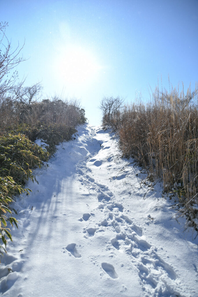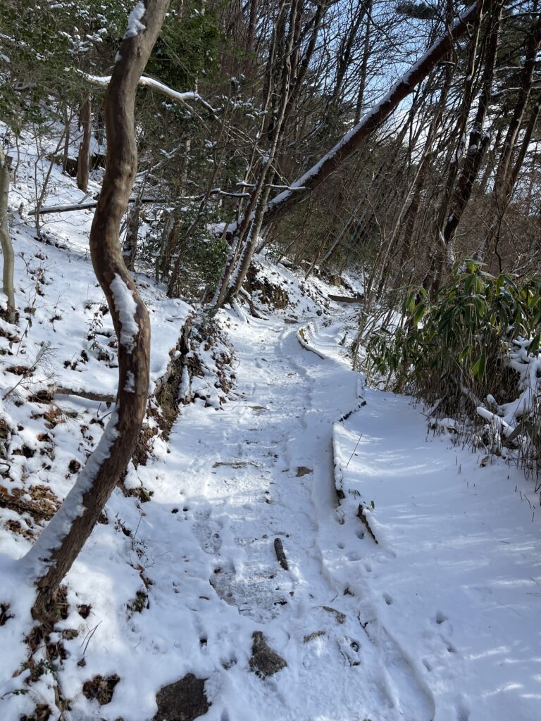今、雪が多いですが登りはトレッキングシューズで